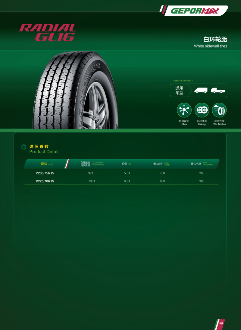 胎側(cè)白環(huán)裝飾,汽車行駛更受矚目,獨(dú)特花紋設(shè)計(jì),具有良好的排水性能和制動(dòng)力