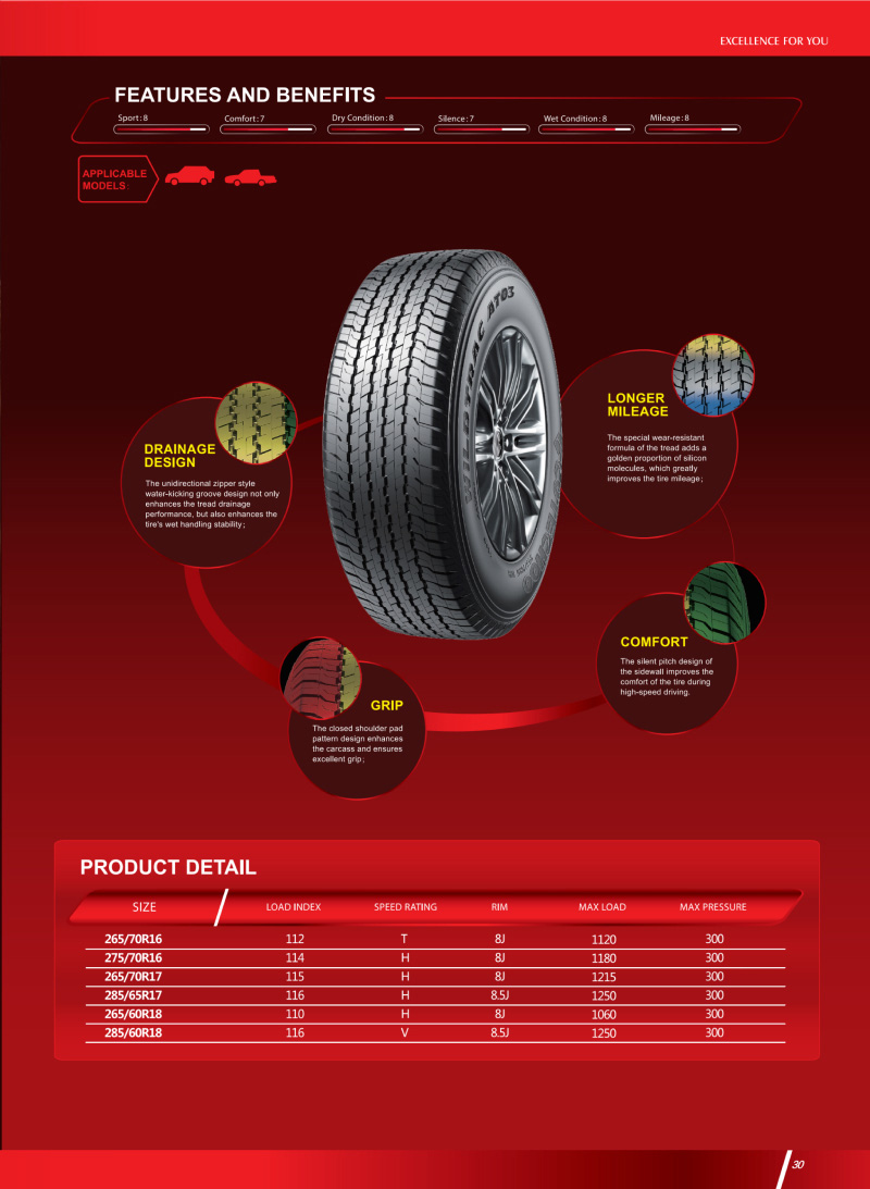 一款優(yōu)秀的全地形輪胎,突破性技術(shù)塑造胎面結(jié)構(gòu),對(duì)各自路況具有良好的適應(yīng)能力。
